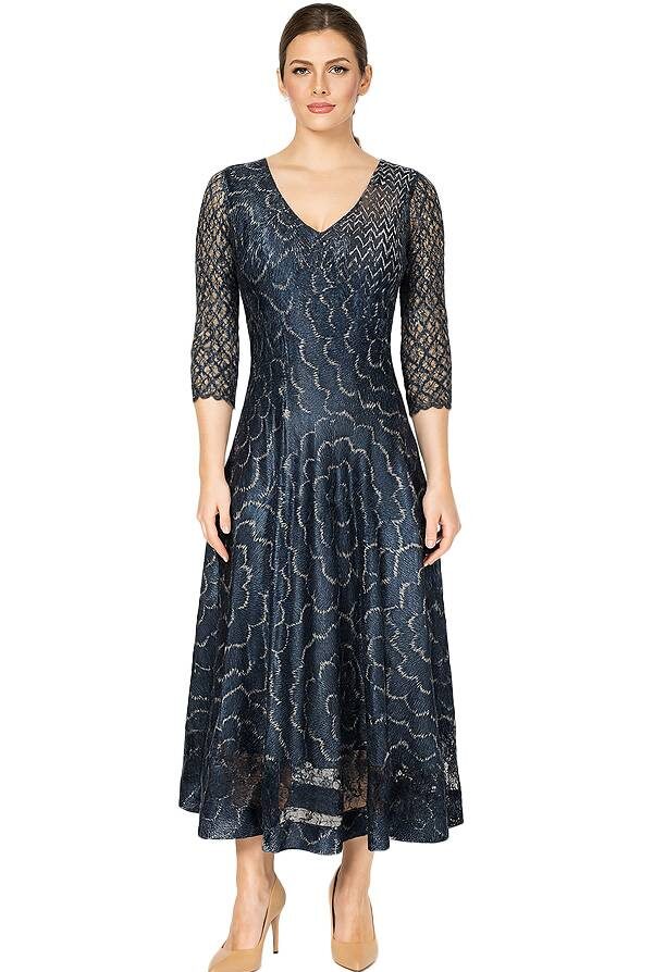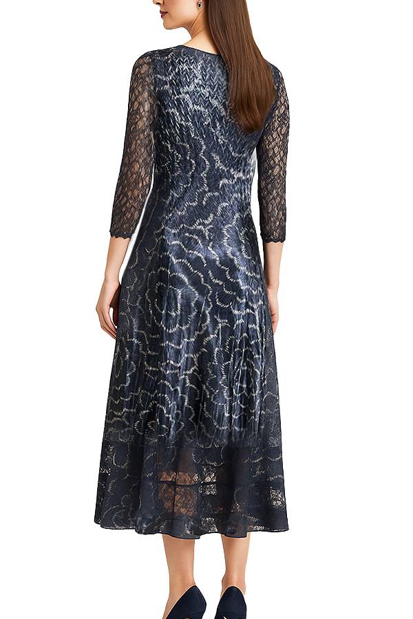 Elegant yet effortless, this navy charmeuse dress features a flattering V-neckline and 3/4 length lace sleeves that add a touch of sophistication. The unique geometric ripple design brings modern texture and movement, making it a standout choice for weddings, cocktail parties, dinners, or professional events. Crafted domestically with care, this dress is not only stylish but also practical—washable and travel ready for ease wherever you go.
