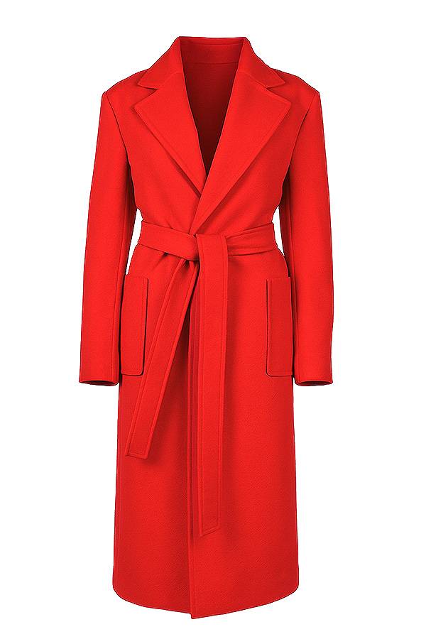 The fluid collar drapes elegantly across the neckline, while a self-tie belt defines the waist for a flattering silhouette. Functional front pockets and a smooth, fully lined interior provide everyday comfort and ease. Designed for versatility, this striking red coat adds a touch of bold elegance to both day and evening ensembles.